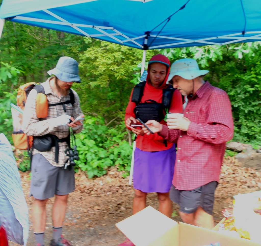 About two hours in we were passed by three hikers whom we’ve met over the past few days. They hike fast and were out of sight in no time. They started on trail two days after us on Easter Monday. We met them again when we crossed Route 191 and found trail magic. It was Sherpa again, waiting for his brother. We talked to Sherpa while having some snacks. He works remotely while travelling along on trail. He designs circuit boards for various devices mainly medical equipment. One of the benefits of modern life. In some jobs you can work remotely. Sherpas brother Galileo, who is hiking the trail, designs telescopes for NASA. The three hikers – Sun God, Sutoshi and Fun Cut, were busy consulting their phones. They were looking for a road walk alternate to town. They were done with Pennsylvania rocks, their feet were smashed.Â