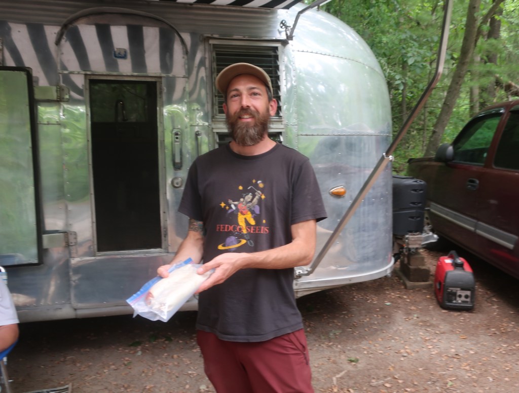 We filled our water bottles from the faucet in the park and only walked about half a mile before encountering trail magic number 2. Brett was set up in an airstream caravan. Brett has his van well set up with solar panels and he had a backup generator if needed. Bretts pickup truck had a fabulous arrangement for his Surly bikepacking bike and his mountain bike. He had done a bike packing trip through Tasmania in 2020 and only just made it back home before the full force of Covid and its disruptions hit the world. It caused him to reassess his life. He sold his house and purchased the Airstream which he has been living out of ever since.