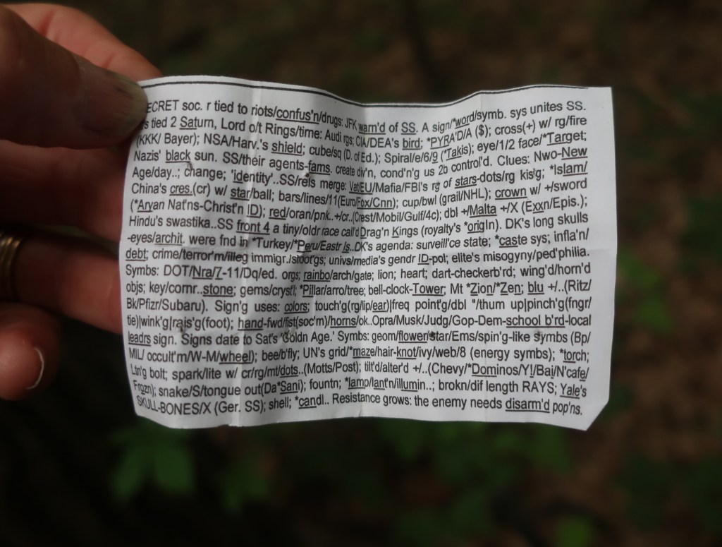 Pennsylvania will also be remembered for some strange conspiracy theories. Along the trail we’ve seen little squares of paper folded tightly and held together by a paper clip. We had seen a number of these sitting on rocks or pinned to trees. Curiosity got the better of us and we opened one. It contained a series of what appeared as gibberish words, hyphenated and disjointed. But on closer reading it’s keywords for just about every conspiracy theory known to man. S