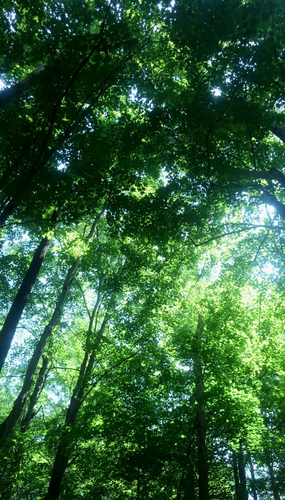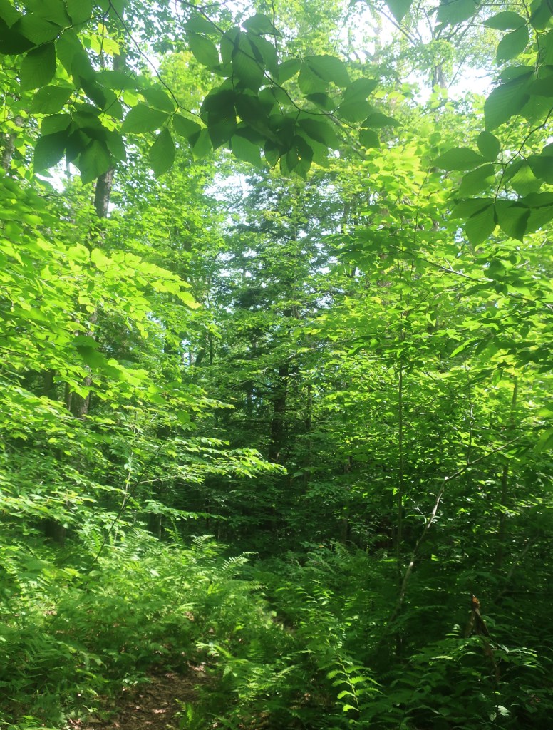 Despite the heat and humidity, the woods were quite pretty. It wasn’t raining, the sun was shining and the iridescent green of the tree canopy was sparkling in the sunlight. We were hungry and were dreaming of what food to have when we pass through town.