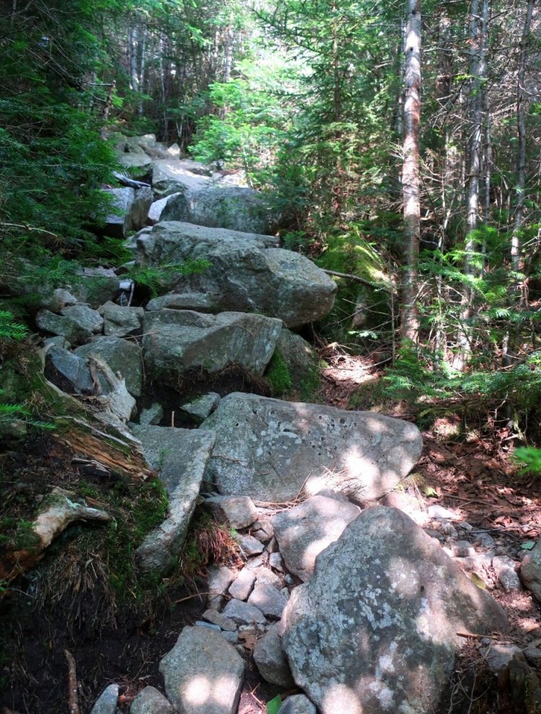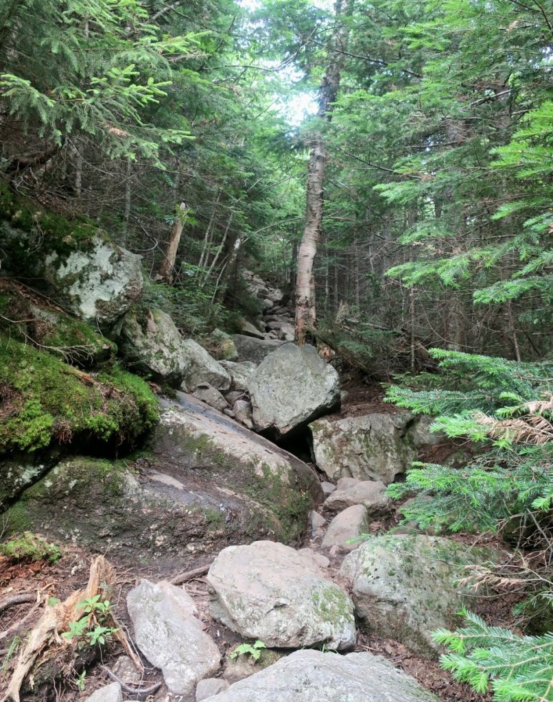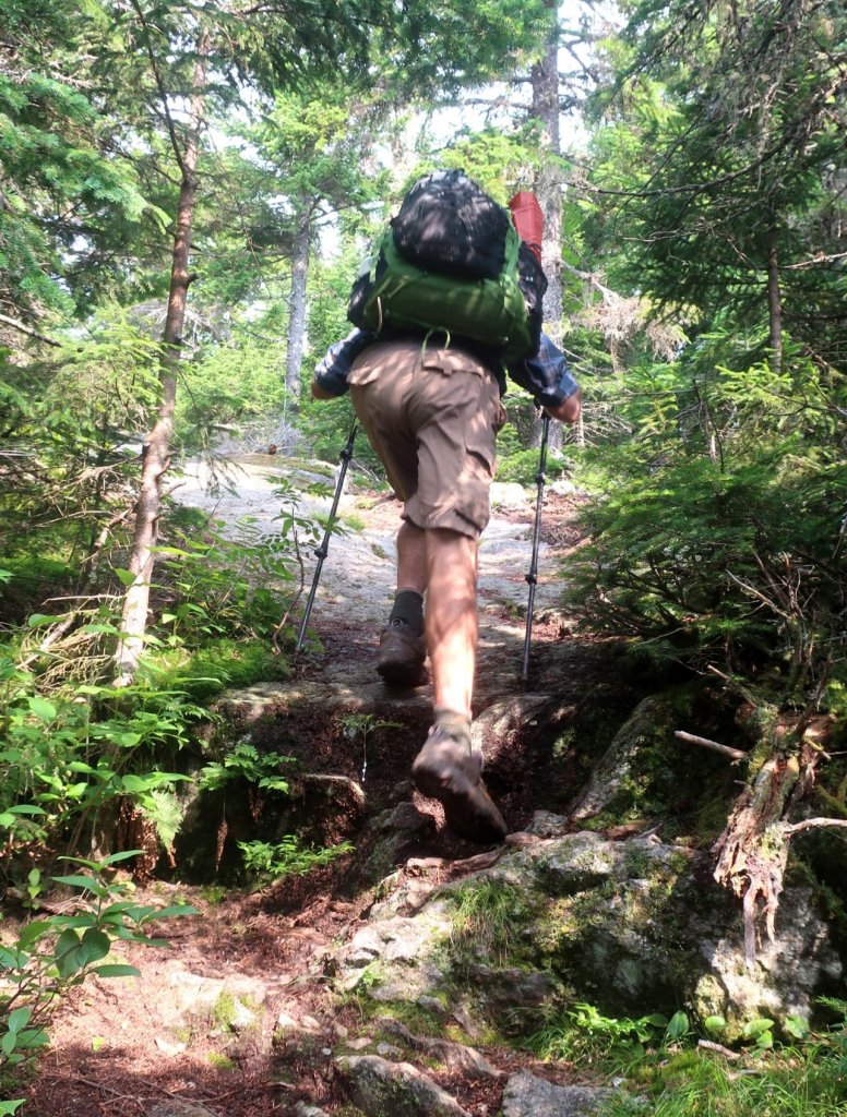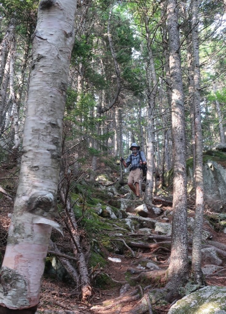 We thought we’d make up some time on the descent but that was not how it turned out. This was just as technical with steep rocky boulders to navigate. We were almost at the bottom of the descent when my knee unexpectedly gave an excruciatingly painful tweak.  It was a slow and careful hobble to a campsite about 2 miles short of Route 27.  We had planned to reach the road  today in order to resupply in Stratton. Rain and thunderstorms are predicted for tomorrow. Might have to be a town zero tomorrow to rest my knee and also escape the rain.