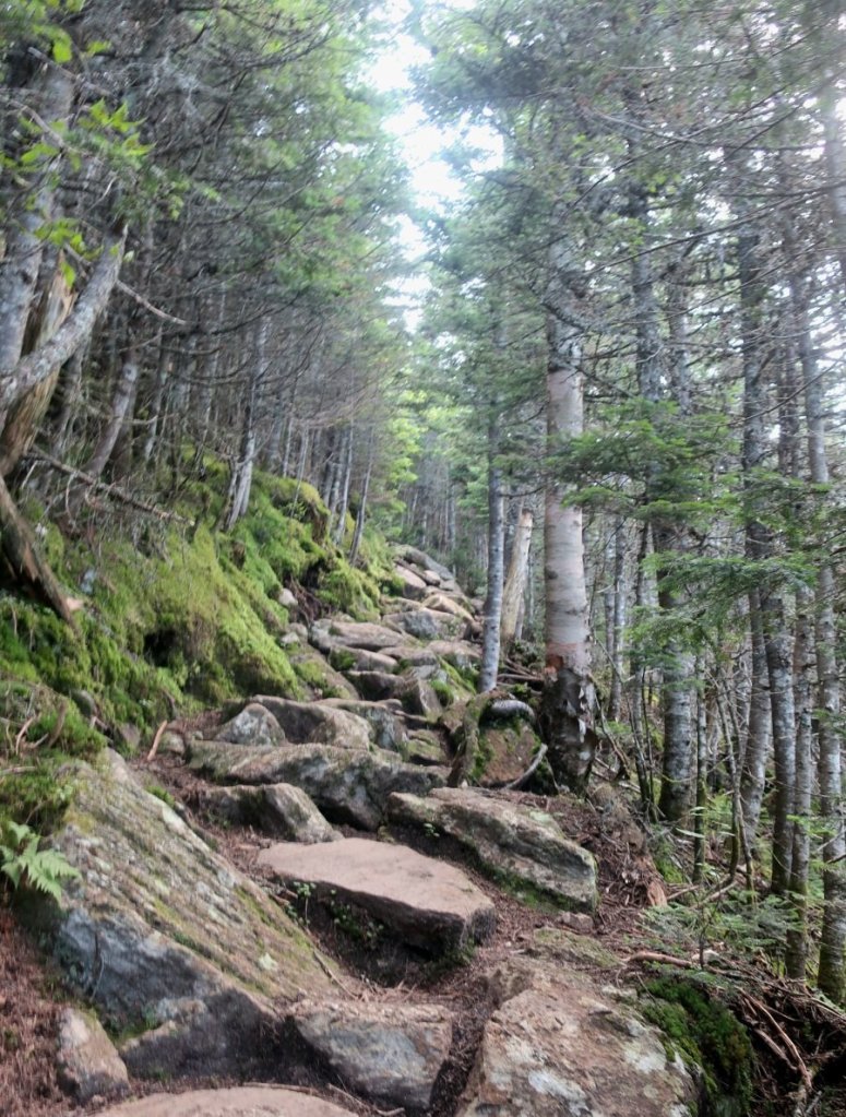 As we started to climb up towards the summit of Mariah Mountain, the first mountain on the way to the Wildcats, the sound of car traffic was replaced by bird song. The higher we got up the mountain the more the birds sang. The wind blowing through the trees was shaking off yesterday’s rain off the leaves making it feel like it was raining. No rain is predicted for at least the next two days so hopefully we can get to Mount Washington before the rain returns on Monday.