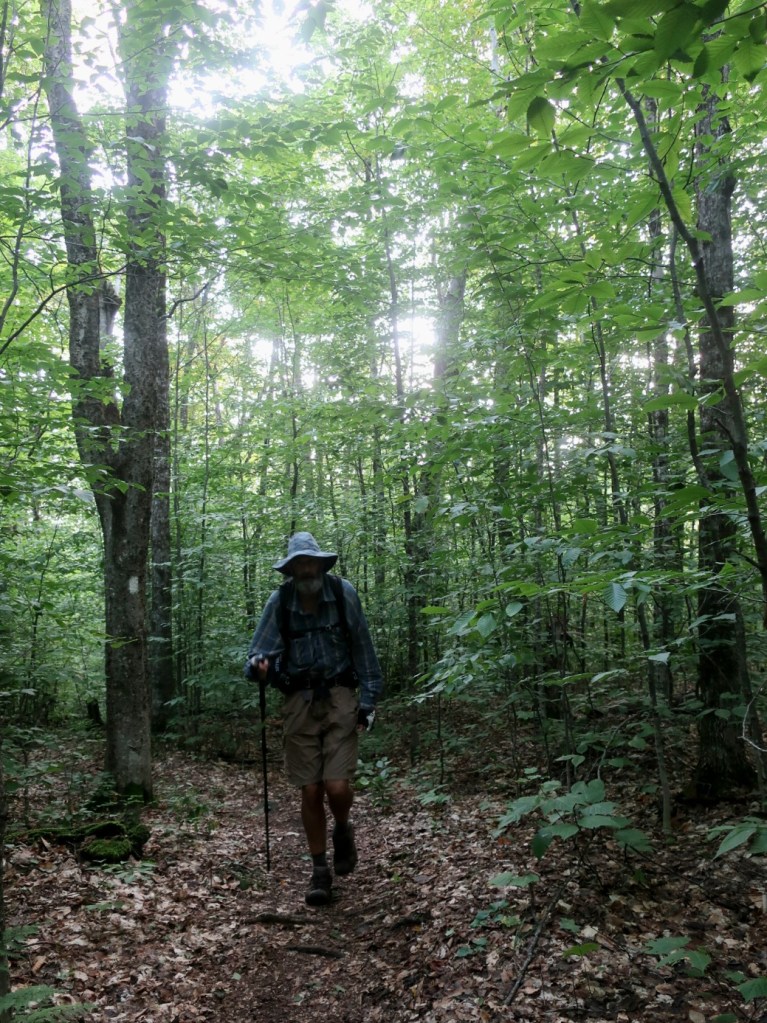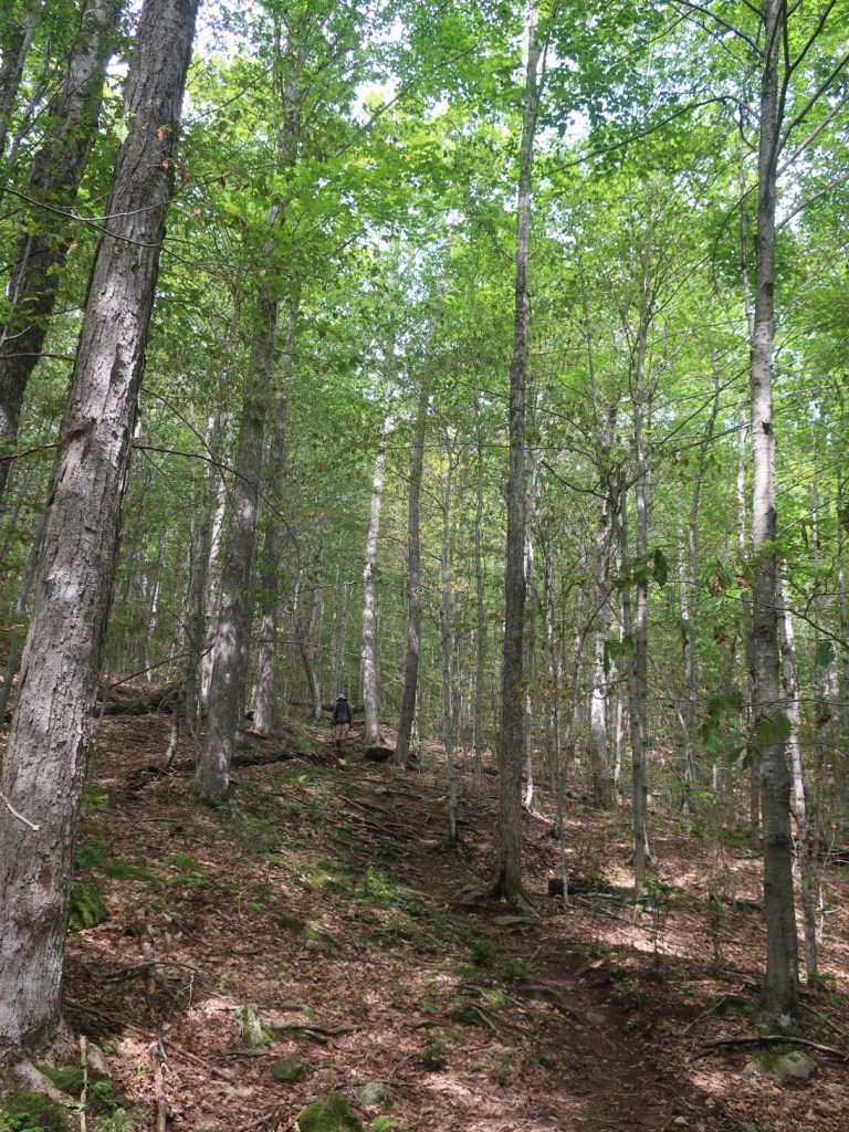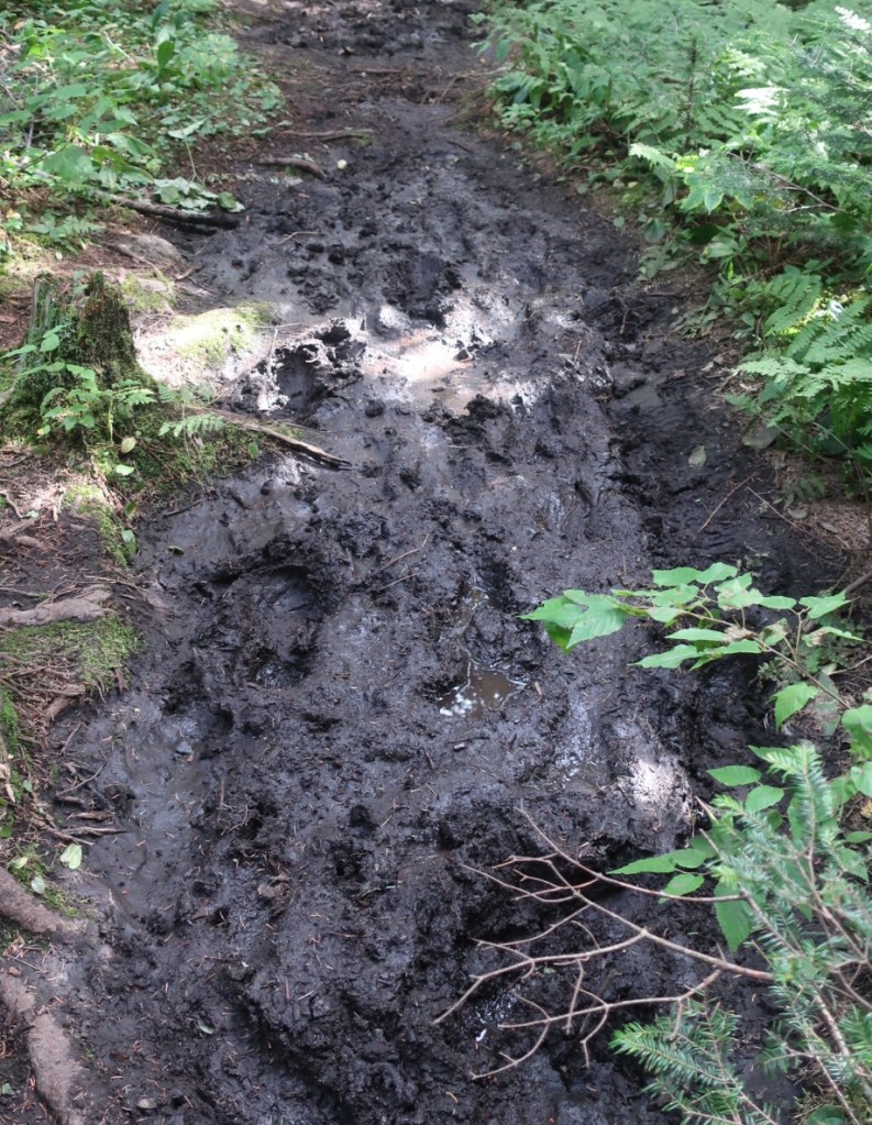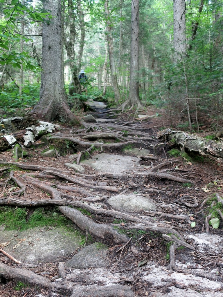 We started to ascend away from Route 25C and just past the beaver pond the trail became very boggy for a long section. It was slow fancy footwork to find dry ground to side step the mud and keep dry feet. It was just around 7:00 when we passed a northbound hiker. We couldn’t raise a hello or a smile from him. He was grumpy, really grumpy and I thought he looked like Vermont sucked the joy out of his life. We couldn’t get a smile and or any form of greeting. He was tramping through the wettest muddiest midline of the trail, looking miserable and it was early morning. The sun was shining, it was warm and it wasn’t raining, how could you be miserable?