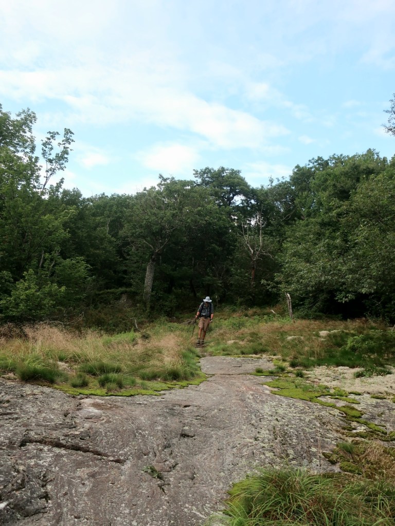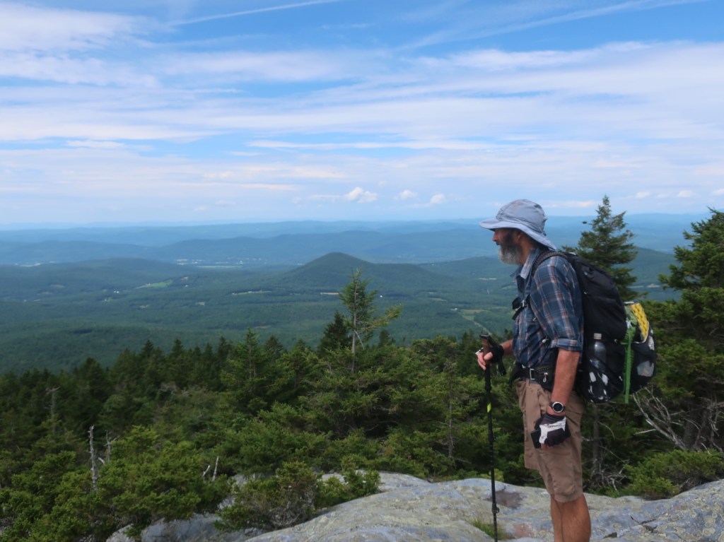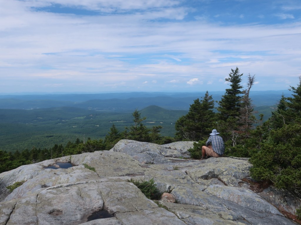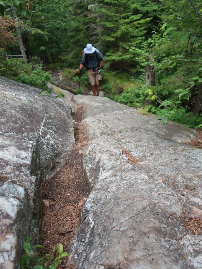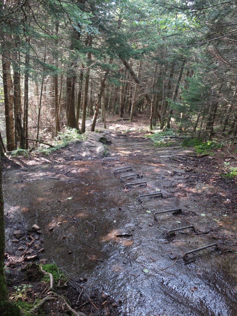 We started to ascend away from Route 25C and just past the beaver pond the trail became very boggy for a long section. It was slow fancy footwork to find dry ground to side step the mud and keep dry feet. It was just around 7:00 when we passed a northbound hiker. We couldn’t raise a hello or a smile from him. He was grumpy, really grumpy and I thought he looked like Vermont sucked the joy out of his life. We couldn’t get a smile and or any form of greeting. He was tramping through the wettest muddiest midline of the trail, looking miserable and it was early morning. The sun was shining, it was warm and it wasn’t raining, how could you be miserable?