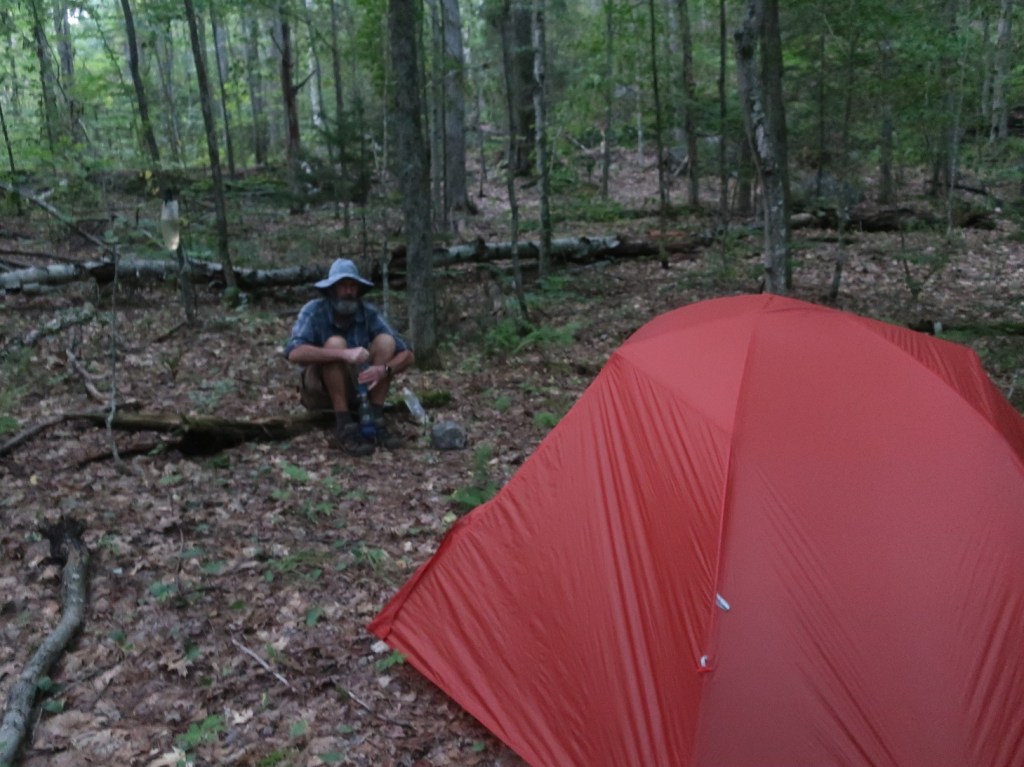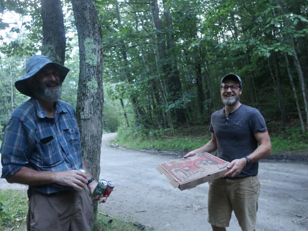 It was close to 7pm when made it down to the Lyme Dorchester Rd where we planned to camp. We met up with Howard who passed us on the climb up Smarts Mt. We first met him in Gorham and have crossed paths a few times over the past week. He told us earlier in the afternoon that he was meeting a friend at the road. His friend brought pizza and local IPA beer. What an amazing unexpected treat. We stayed to chat with Howard and his friend for a while. It looked like it was getting dark soon and the sky was darkening. We set up our tent back in the woods. And right on cue the rain arrived around 9pm. It rained steadily right through the night. We are so bone weary tired, we can smell the finish line.