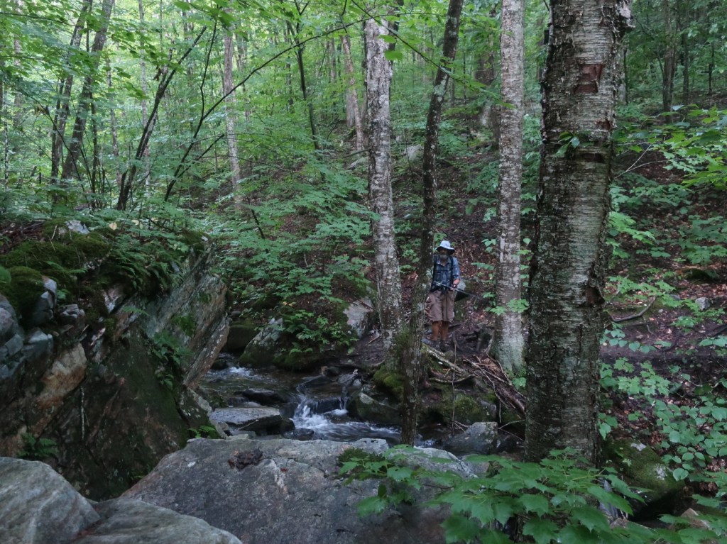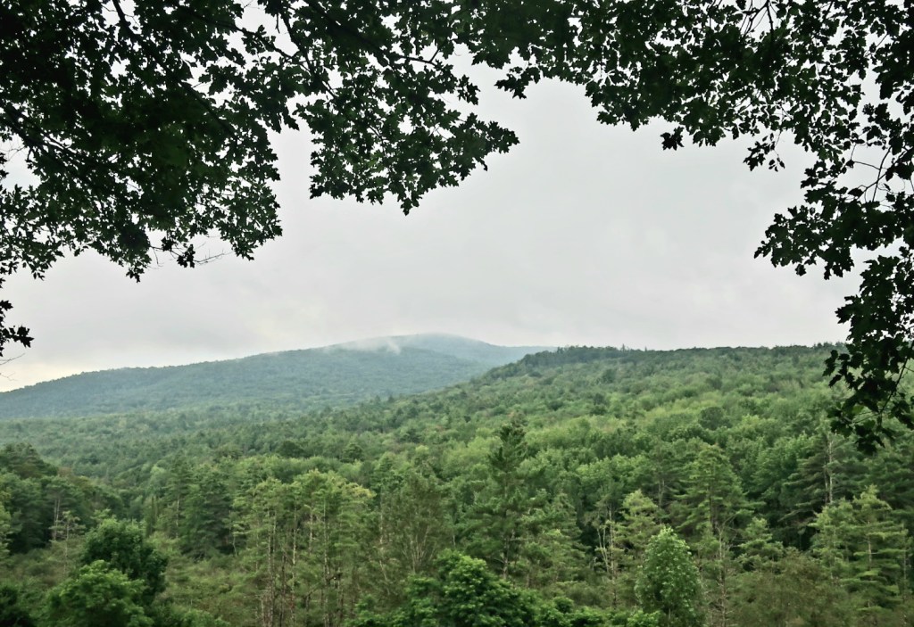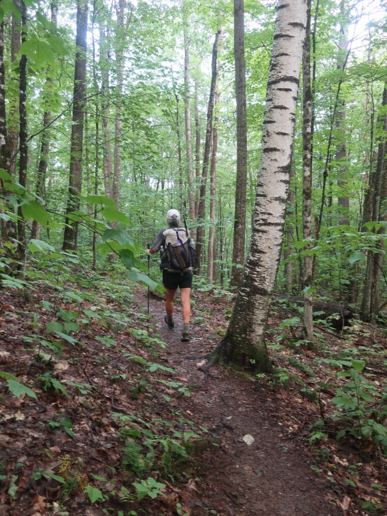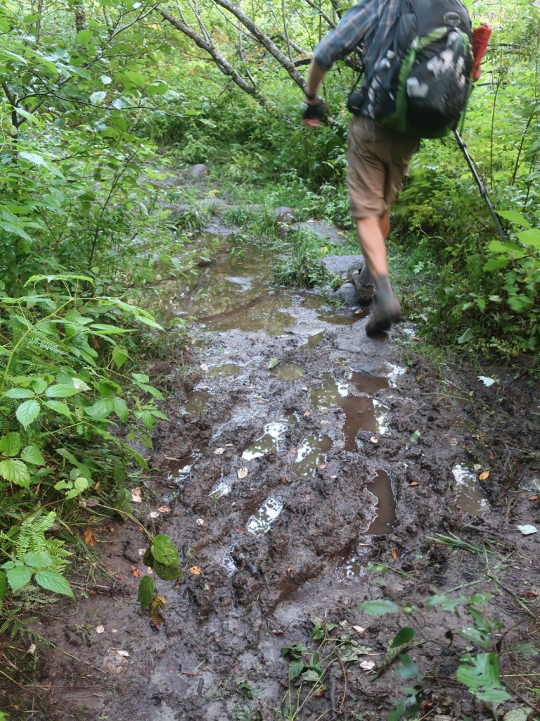 It rained all through the night. We stayed dry, no rain made it’s way under the tent. We were feeling pretty happy and woke up in the pitch black of the woods. It had stopped raining so we packed up and were on our way at 6 a.m. It wasn’t raining but it was dark and surprisingly warm. It’s the warmest we’ve been for quite a few weeks. The trail ascended away from Lyme-Dorchester Road up towards the darkness of the woods and on a puddly wet and muddy trail. We followed the Skiway Trail towards its crossing of Dorchester Road further along. The trail was saturated by last night’s rain. It was overgrown in sections towards the road crossing and with the overnight rain clinging to the trailside vegetation we were sodden wet by the time we got out on the road.