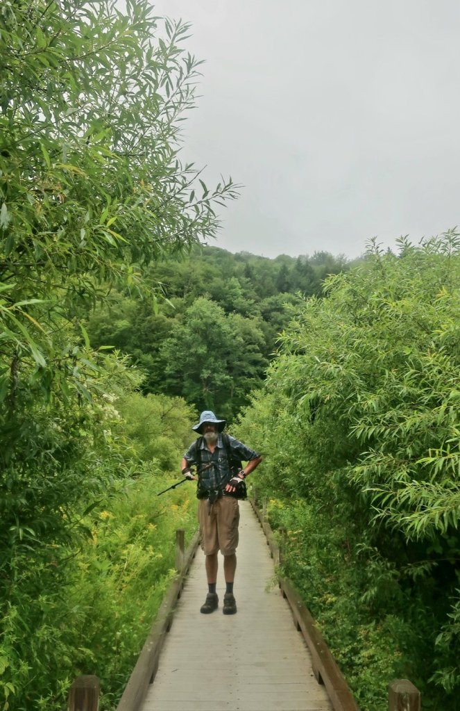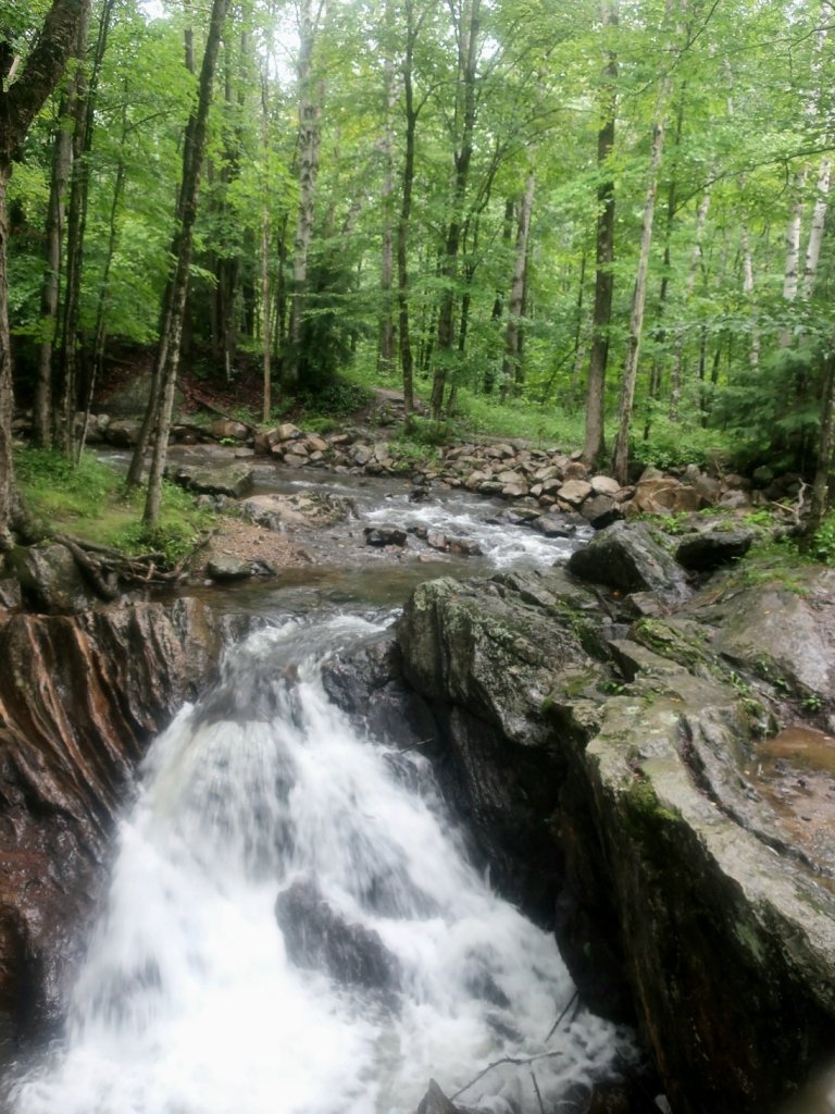 From the summit we had a long descent on reasonably good trail down to River Rd, one of the roads leading to Killington. I was dreaming of escape. We had cell service so I checked the weather. The rain should stop and won’t return till late afternoon. We were happy to see that we should have quite a few hours of relatively dry hiking. And soon after reading this the sky opened and quite heavy rain set in. So much for weather prediction.