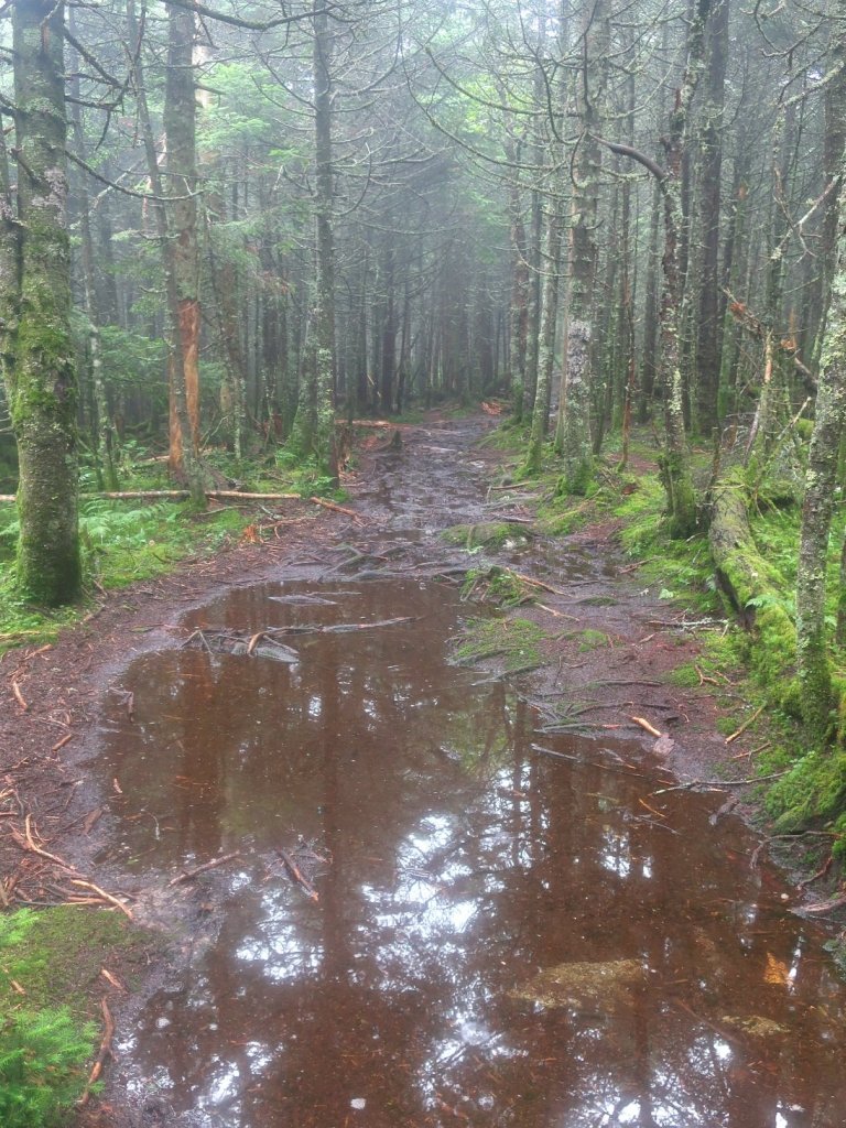 As there was nothing to see we started our descent of Mt Killington. In the brief periods when the rain stopped, flashes of sunlight teased us. It illuminated the wet vegetation giving everything a luminous quality and quite beautiful for a short while. By the time we started the descent, clouds closed in again and rain threatened by continuing to drizzle and intensifying every now and then. The woods looked dark and dank and we were really quiet in the Grimm Brothers fairy tale.